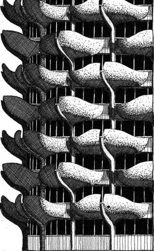 Ce dessin s’attache à cette ambiguïté formelle, entre système et singularité. Par la ligne, il met en évidence la logique modulaire du bâtiment, sa dimension presque végétale, et la manière dont une forme répétée peut générer une architecture expressive, dense et identifiable.